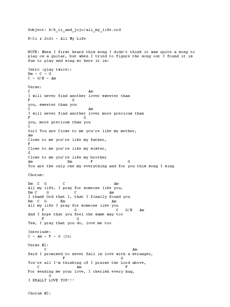 Dm C G C Am All my life I pray for someone like you Dm C G C Am I thank God that I that I finally found you Dm C G Em Am All my life I pray for someone like you F G C GB Am And. All my life guitar chords and lyrics by k ci and jojo. You may only use this f.